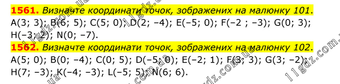 1561. Визначте координати точок, зображених на малюнку 101. А(3; 3); B(6; 5); С(5; 0); D(2; –4); E(–5; 0); F(–2 ; –3); G(0; 3); Н(–3; 2); N(0; –7). 1562. Визначте координати точок, зображених на малюнку 102. А(5; 0); В(0; –4); С(0; 5); D(–5; 0); Е(–2; 1); F(З; 3); G(3; –2); H(7; –3); К(–4; –3); L(–5; 5); N(6; 6).