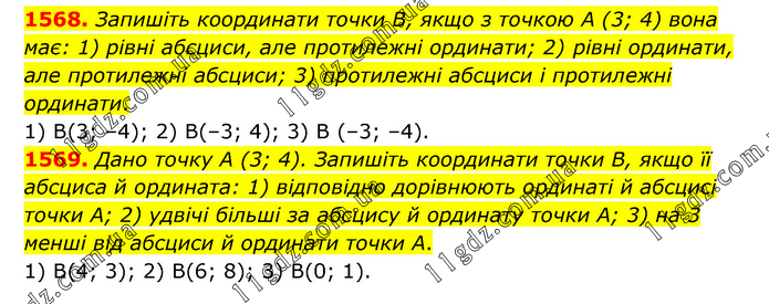 1568. Запишіть координати точки В, якщо з точкою А (3; 4) вона має: 1) рівні абсциси, але протилежні ординати; 2) рівні ординати, але протилежні абсциси; 3) протилежні абсциси і протилежні ординати. 1) В(3; –4); 2) В(–3; 4); 3) В (–3; –4). 1569. Дано точку А (3; 4). Запишіть координати точки В, якщо її абсциса й ордината: 1) відповідно дорівнюють ординаті й абсцисі точки А; 2) удвічі більші за абсцису й ординату точки А; 3) на 3 менші від абсциси й ординати точки А. 1) В(4; 3); 2) В(6; 8); 3) В(0; 1).