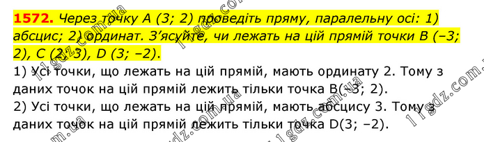 Через точку А (3; 2) проведіть пряму, паралельну осі: 1) абсцис; 2) ординат. З’ясуйте, чи лежать на цій прямій точки В (–3; 2), C (2; 3), D (3; –2). 1) Усі точки, що лежать на цій прямій, мають ординату 2. Тому з даних точок на цій прямій лежить тільки точка В(–3; 2). 2) Усі точки, що лежать на цій прямій, мають абсцису 3. Тому з даних точок на цій прямій лежить тільки точка D(3; –2).
