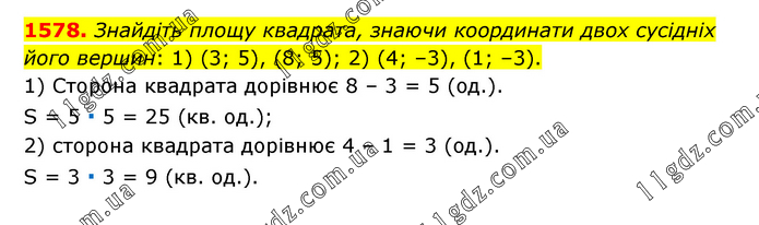 Знайдіть площу квадрата, знаючи координати двох сусідніх його вершин: 1) (3; 5), (8; 5); 2) (4; –3), (1; –3). 1) Сторона квадрата дорівнює 8 – 3 = 5 (од.). S = 5 ∙ 5 = 25 (кв. од.); 2) сторона квадрата дорівнює 4 – 1 = 3 (од.). S = 3 ∙ 3 = 9 (кв. од.).