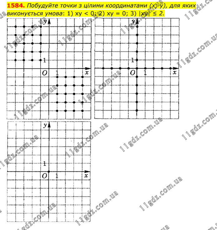 Побудуйте точки з цілими координатами (х; у), для яких виконується умова: 1) ху < 0; 2) ху = 0; 3) |xy| ≤ 2.