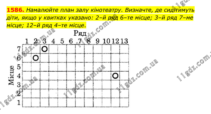 Намалюйте план залу кінотеатру. Визначте, де сидітимуть діти, якщо у квитках указано: 2–й ряд 6–те місце; 3–й ряд 7–ме місце; 12–й ряд 4–те місце.