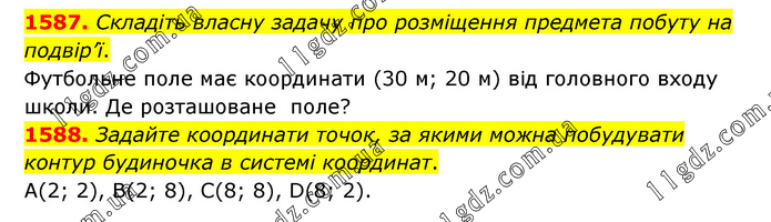 1587. Складіть власну задачу про розміщення предмета побуту на подвір’ї. Футбольне поле має координати (30 м; 20 м) від головного входу школи. Де розташоване поле? 1588. Задайте координати точок, за якими можна побудувати контур будиночка в системі координат. А(2; 2), В(2; 8), С(8; 8), D(8; 2).