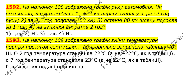 1592. На малюнку 108 зображено графік руху автомобіля. Чи правильно, що автомобіль: 1) зробив першу зупинку через 2 год руху; 2) за 3,5 год подолав 160 км; 3) останні 80 км шляху подолав за 1 год; 4) на зупинки витратив 2 год? 1) Так. 2) Ні. 3) Так. 4) Ні. 1593. На малюнку 109 зображено графік зміни температури повітря протягом семи годин. Чи правильно заповнено таблицю 40? Ні. О 2 год температура становила 22°С (а не –22°С, як в таблиці), о 7 год температура становила 23°С (а не 22°С, як в таблиці). Решта даних подані правильно.
