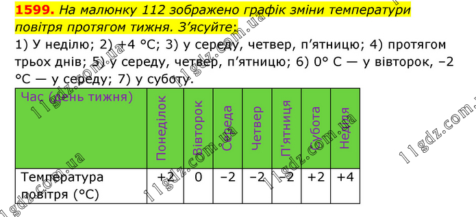 На малюнку 112 зображено графік зміни температури повітря протягом тижня. З’ясуйте: 1) У неділю; 2) +4 °С; 3) у середу, четвер, п’ятницю; 4) протягом трьох днів; 5) у середу, четвер, п’ятницю; 6) 0° С — у вівторок, –2 °С — у середу; 7) у суботу.