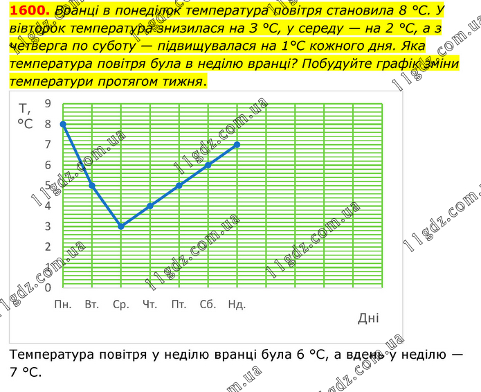 Вранці в понеділок температура повітря становила 8 °С. У вівторок температура знизилася на З °С, у середу — на 2 °С, а з четверга по суботу — підвищувалася на 1°С кожного дня. Яка температура повітря була в неділю вранці? Побудуйте графік зміни температури протягом тижня. Температура повітря у неділю вранці була 6 °С, а вдень у неділю — 7 °С.