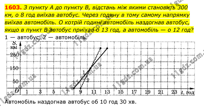 З пункту А до пункту В, відстань між якими становить 300 км, о 8 год виїхав автобус. Через годину в тому самому напрямку виїхав автомобіль. O котрій годині автомобіль наздогнав автобус, якщо в пункт В автобус приїхав о 13 год, а автомобіль — о 12 год? 1 — автобус, 2 — автомобіль. Автомобіль наздогнав автобус об 10 год 30 хв.