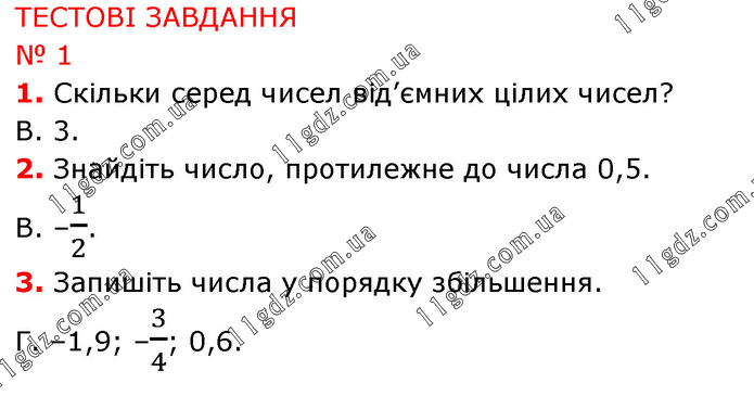 ТЕСТОВІ ЗАВДАННЯ № 1 1. Скільки серед чисел від’ємних цілих чисел? В. 3. 2. Знайдіть число, протилежне до числа 0,5. В. –1/2. 3. Запишіть числа у порядку збільшення. Г. –1,9; –3/4; 0,6.