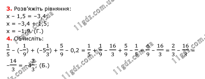 3. Розв’яжіть рівняння: х – 1,5 = –3,4; х = –3,4 + 1,5; х = –1,9. (Г.) 4. Обчисліть: 1/5 – (–1/9) + (–51/3) + 5/9 – 0,2 = 1/5 + 1/9 – 16/3 + 5/9 – 1/5 = 6/9 – 16/3 = 2/3 – 16/3 = –14/3 = –42/3; (Б.)
