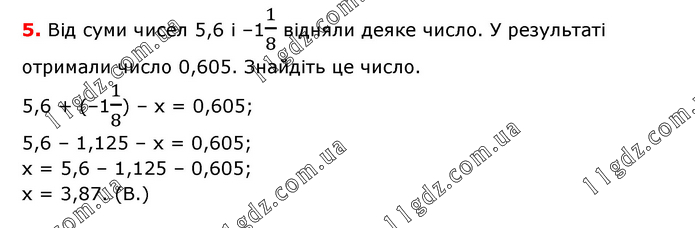 Від суми чисел 5,6 і –11/8 відняли деяке число. У результаті отримали число 0,605. Знайдіть це число. 5,6 + (–11/8) – х = 0,605; 5,6 – 1,125 – х = 0,605; х = 5,6 – 1,125 – 0,605; х = 3,87. (В.)