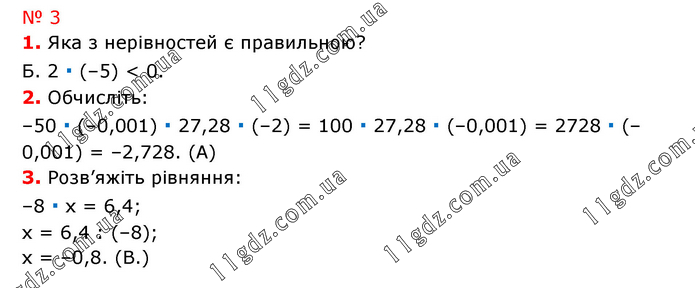 № 3 1. Яка з нерівностей є правильною? Б. 2 ∙ (–5) < 0. 2. Обчисліть: –50 ∙ (–0,001) ∙ 27,28 ∙ (–2) = 100 ∙ 27,28 ∙ (–0,001) = 2728 ∙ (–0,001) = –2,728. (А) 3. Розв’яжіть рівняння: –8 ∙ х = 6,4; х = 6,4 : (–8); х = –0,8. (В.)