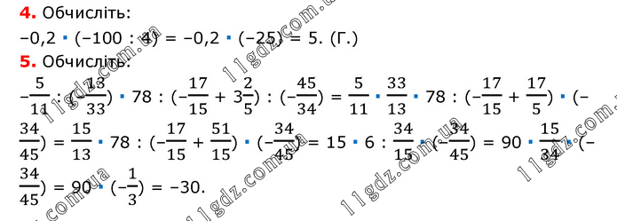 4. Обчисліть: –0,2 ∙ (–100 : 4) = –0,2 ∙ (–25) = 5. (Г.) 5. Обчисліть: –5/11 : (–13/33) ∙ 78 : (–17/15 + 32/5) : (–45/34) = 5/11 ∙ 33/13 ∙ 78 : (–17/15 + 17/5) ∙ (–34/45) = 15/13 ∙ 78 : (–17/15 + 51/15) ∙ (–34/45) = 15 ∙ 6 : 34/15 ∙ (–34/45) = 90 ∙ 15/34 ∙ (–34/45) = 90 ∙ (–1/3) = –30.
