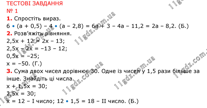 ТЕСТОВІ ЗАВДАННЯ № 1 1. Спростіть вираз. 6 • (а + 0,5) – 4 • (а – 2,8) = 6а + 3 – 4а – 11,2 = 2а – 8,2. (Б.) 2. Розв’яжіть рівняння. 2,5х + 12 = 2х – 13; 2,5х – 2х = –13 – 12; 0,5х = –25; х = –50. (Г.) 3. Сума двох чисел дорівнює 30. Одне із чисел у 1,5 рази більше за інше. Знайдіть ці числа. х + 1,5х = 30; 2,5х = 30; х = 12 – І число; 12 • 1,5 = 18 – ІІ число. (Б.)