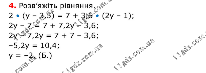 Розв’яжіть рівняння. 2 • (у – 3,5) = 7 + 3,6 • (2у – 1); 2у – 7 = 7 + 7,2у – 3,6; 2у – 7,2у = 7 + 7 – 3,6; –5,2у = 10,4; у = –2. (Б.)