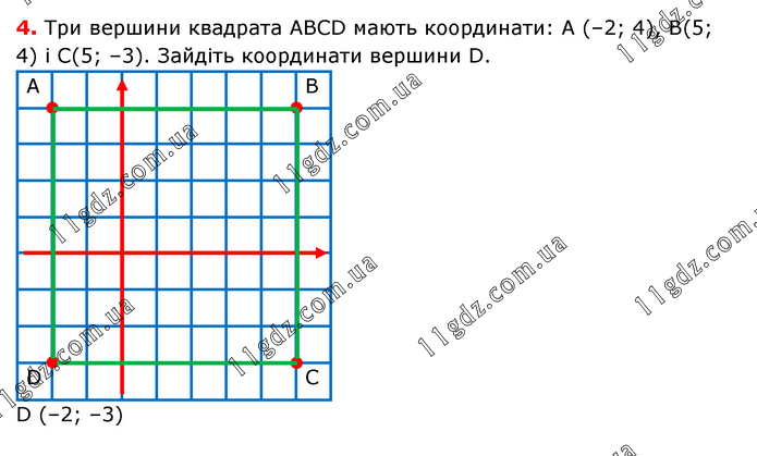 Три вершини квадрата ABCD мають координати: А (–2; 4), В(5; 4) і С(5; –3). Зайдіть координати вершини D.