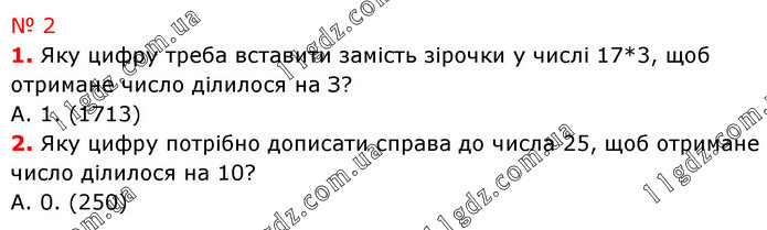 № 2 1. Яку цифру треба вставити замість зірочки у числі 17*3, щоб отримане число ділилося на З? А. 1. (1713) 2. Яку цифру потрібно дописати справа до числа 25, щоб отримане число ділилося на 10? А. 0. (250)