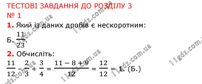ТЕСТОВІ ЗАВДАННЯ ДО РОЗДІЛУ 3 № 1 1. Який із даних дробів є нескоротним: Б. 11/23. 2. Обчисліть: 11/12 – 2/3 + 3/4 = (11 - 8 + 9)/12 = 12/12 = 1. (Б.)
