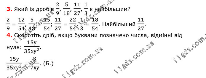 3. Який із дробів 2/9, 5/18, 11/27, 1/3 є найбільшим? 2/9 = 12/54, 5/18 = 15/54; 11/27 = 22/54, 1/3 = 18/54. Найбільший 11/27. 4. Скоротіть дріб, якщо буквами позначено числа, відмінні від нуля: 15у/(35ху^2 ). 15у/(35ху^2 ) = 3/7ху. (Б.)