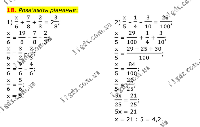 Розв’яжіть рівняння: 1) х/6 + 7/8 + 2/3 = 23/8; х/6 = 19/8 – 7/8 – 2/3; х/6 = 3/2 – 2/3; х/6 = 9/6 – 4/6; х/6 = 5/6; х = 5. 2) х/5 – 1/4 – 3/10 = 29/100; х/5 = 29/100 + 1/4 + 3/10; х/5 = (29 + 25 + 30)/100; х/5 = 84/100; х/5 = 21/25; 5х/25 = 21/25; 5х = 21 х = 21 : 5 = 4,2.