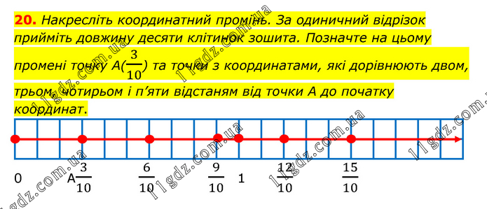 Накресліть координатний промінь. За одиничний відрізок прийміть довжину десяти клітинок зошита. Позначте на цьому промені точку А(3/10) та точки з координатами, які дорівнюють двом, трьом, чотирьом і п’яти відстаням від точки А до початку координат.