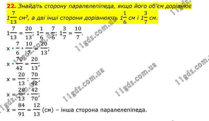 Знайдіть сторону паралелепіпеда, якщо його об’єм дорівнює 17/13 см3, а дві інші сторони дорівнюють 11/6 см і 13/7 см. 17/13 = 20/13; 11/6 = 7/6; 13/7 = 10/7. х ∙ 7/6 ∙ 10/7 = 20/13; х ∙ 70/42 = 20/13; х = 20/13 : 70/42; х = 20/13 ∙ 42/70; х = 84/91 = 12/13 (см) – інша сторона паралелепіпеда.