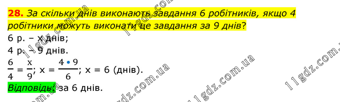 За скільки днів виконають завдання 6 робітників, якщо 4 робітники можуть виконати це завдання за 9 днів? 6 р. – х днів; 4 р. – 9 днів. 6/4 = х/9; х = (4 • 9)/6; х = 6 (днів). Відповідь: за 6 днів.