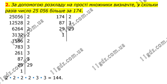 За допомогою розкладу на прості множники визначте, у скільки разів число 25 056 більше за 174. 2 ∙ 2 ∙ 2 ∙ 2 ∙ 3 ∙ 3 = 144.