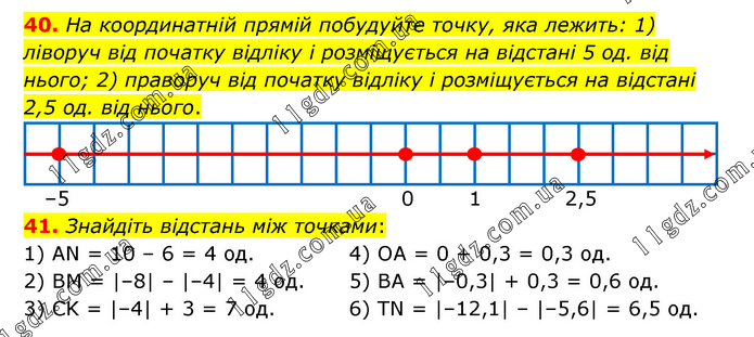 На координатній прямій побудуйте точку, яка лежить: 1) ліворуч від початку відліку і розміщується на відстані 5 од. від нього; 2) праворуч від початку відліку і розміщується на відстані 2,5 од. від нього. 41. Знайдіть відстань між точками: 1) АN = 10 – 6 = 4 од. 2) BM = |–8| – |–4| = 4 од. 3) CK = |–4| + 3 = 7 од. 4) OA = 0 + 0,3 = 0,3 од. 5) BA = |–0,3| + 0,3 = 0,6 од. 6) TN = |–12,1| – |–5,6| = 6,5 од.