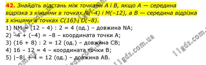 Знайдіть відстань між точками А і В, якщо А — середина відрізка з кінцями в точках N(–4) і М(–12), а В — середина відрізка з кінцями в точках С(16) і D(–8). 1) NM = (12 – 4) : 2 = 4 (од.) – довжина NA; 2) –4 + (–4) = –8 – координата точки А; 3) (16 + 8) : 2 = 12 (од.) – довжина СВ; 4) 16 – 12 = 4 – координата точки В; 5) |–8| + 4 = 12 (од.) – довжина АВ.