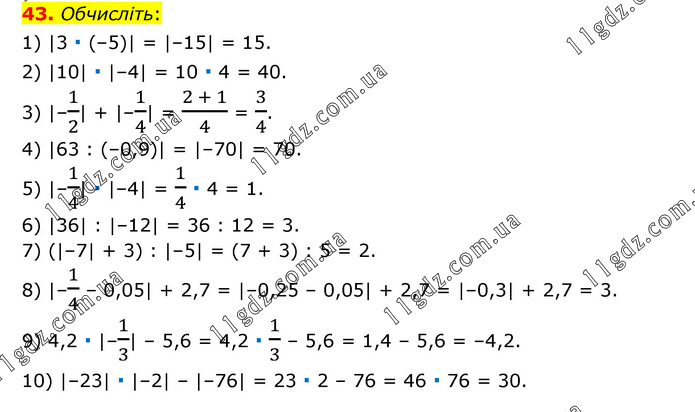 Обчисліть: 1) |3 ∙ (–5)| = |–15| = 15. 2) |10| ∙ |–4| = 10 ∙ 4 = 40. 3) |–1/2| + |–1/4| = (2 + 1)/4 = 3/4. 4) |63 : (–0,9)| = |–70| = 70. 5) |–1/4| ∙ |–4| = 1/4 ∙ 4 = 1. 6) |36| : |–12| = 36 : 12 = 3. 7) (|–7| + 3) : |–5| = (7 + 3) : 5 = 2. 8) |–1/4 – 0,05| + 2,7 = |–0,25 – 0,05| + 2,7 = |–0,3| + 2,7 = 3. 9) 4,2 ∙ |–1/3| – 5,6 = 4,2 ∙ 1/3 – 5,6 = 1,4 – 5,6 = –4,2. 10) |–23| ∙ |–2| – |–76| = 23 ∙ 2 – 76 = 46 ∙ 76 = 30.