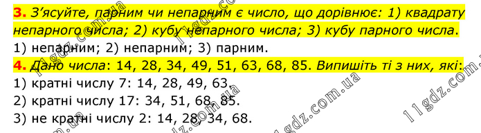 3. З’ясуйте, парним чи непарним є число, що дорівнює: 1) квадрату непарного числа; 2) кубу непарного числа; 3) кубу парного числа. 1) непарним; 2) непарним; 3) парним. 4. Дано числа: 14, 28, 34, 49, 51, 63, 68, 85. Випишіть ті з них, які: 1) кратні числу 7: 14, 28, 49, 63. 2) кратні числу 17: 34, 51, 68, 85. 3) не кратні числу 2: 14, 28, 34, 68.
