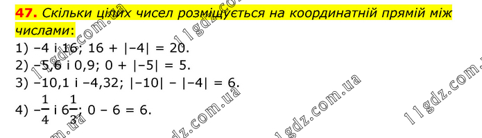 Скільки цілих чисел розміщується на координатній прямій між числами: 1) –4 і 16; 16 + |–4| = 20. 2) –5,6 і 0,9; 0 + |–5| = 5. 3) –10,1 і –4,32; |–10| – |–4| = 6. 4) –1/4 і 61/3; 0 – 6 = 6.