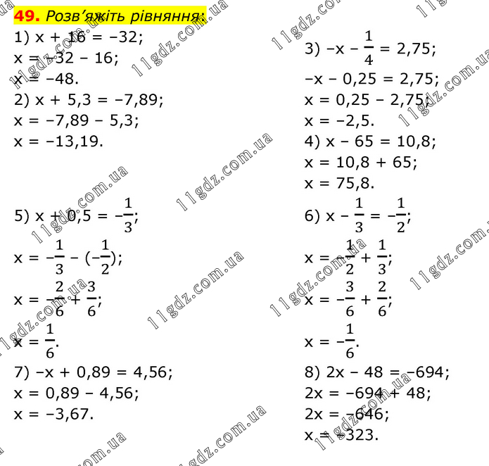 Розв’яжіть рівняння: 1) х + 16 = –32; х = –32 – 16; х = –48. 2) х + 5,3 = –7,89; х = –7,89 – 5,3; х = –13,19. 3) –х – 1/4 = 2,75; –х – 0,25 = 2,75; х = 0,25 – 2,75; х = –2,5. 4) х – 65 = 10,8; х = 10,8 + 65; х = 75,8. 5) х + 0,5 = –1/3; х = –1/3 – (–1/2); х = –2/6 + 3/6; х = 1/6. 6) х – 1/3 = –1/2; х = –1/2 + 1/3; х = –3/6 + 2/6; х = –1/6. 7) –х + 0,89 = 4,56; х = 0,89 – 4,56; х = –3,67. 8) 2х – 48 = –694; 2х = –694 + 48; 2х = –646; х = –323.