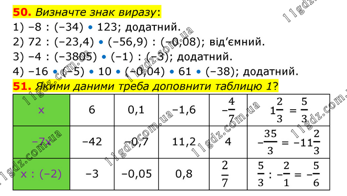 50. Визначте знак виразу: 1) –8 : (–34) • 123; додатний. 2) 72 : (–23,4) • (–56,9) : (–0,08); від’ємний. 3) –4 : (–3805) • (–1) : (–3); додатний. 4) –16 • (–5) • 10 • (–0,04) • 61 • (–38); додатний. 51. Якими даними треба доповнити таблицю 1?