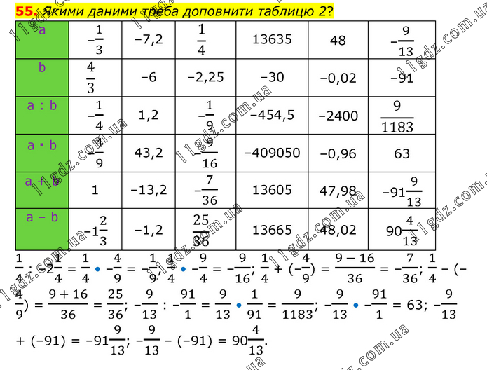1/4 : –21/4 = 1/4 • –4/9 = –1/9; 1/4 • –9/4 = –9/16; 1/4 + (–4/9) = (9 - 16)/36 = –7/36; 1/4 – (–4/9) = (9 + 16)/36 = 25/36; –9/13 : –91/1 = 9/13 • 1/91 = 9/1183; –9/13 • –91/1 = 63; –9/13 + (–91) = –919/13; –9/13 – (–91) = 904/13.