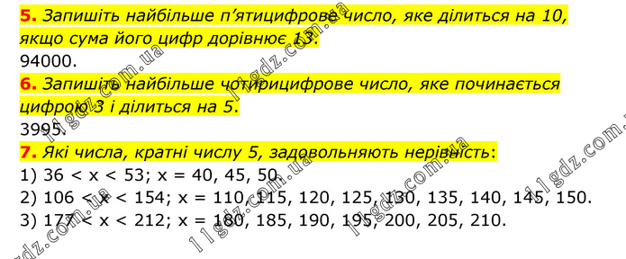 5. Запишіть найбільше п’ятицифрове число, яке ділиться на 10, якщо сума його цифр дорівнює 13. 94000. 6. Запишіть найбільше чотирицифрове число, яке починається цифрою 3 і ділиться на 5. 3995. 7. Які числа, кратні числу 5, задовольняють нерівність: 1) 36 < х < 53; х = 40, 45, 50. 2) 106 < х < 154; х = 110, 115, 120, 125, 130, 135, 140, 145, 150. 3) 177 < х < 212; х = 180, 185, 190, 195, 200, 205, 210.