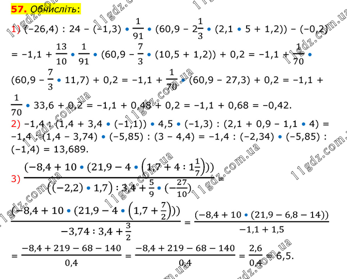 Обчисліть: 1) (–26,4) : 24 – (–1,3) • 1/91 • (60,9 – 21/3 • (2,1 • 5 + 1,2)) – (–0,2) = –1,1 + 13/10 • 1/91 • (60,9 – 7/3 • (10,5 + 1,2)) + 0,2 = –1,1 + 1/70 • (60,9 – 7/3 • 11,7) + 0,2 = –1,1 + 1/70 • (60,9 – 27,3) + 0,2 = –1,1 + 1/70 • 33,6 + 0,2 = –1,1 + 0,48 + 0,2 = –1,1 + 0,68 = –0,42. 2) –1,4 : (1,4 + 3,4 • (–1,1)) • 4,5 • (–1,3) : (2,1 + 0,9 – 1,1 • 4) = –1,4 : (1,4 – 3,74) • (–5,85) : (3 – 4,4) = –1,4 : (–2,34) • (–5,85) : (–1,4) = 13,689. 3) ((-8,4 + 10 • (21,9 - 4 • (1,7 + 4 ∶ 1 1/7))))/(((-2,2) • 1,7) ∶ 3,4 + 5/9 • (-27/10)) = ((-8,4 + 10 • (21,9 - 4 • (1,7 + 7/2))))/(-3,74 ∶ 3,4 + 3/2) = ((-8,4 + 10 • (21,9 - 6,8 - 14)))/(-1,1 + 1,5) = (-8,4 + 219 - 68 - 140)/0,4 = (-8,4 + 219 - 68 - 140)/0,4 = 2,6/0,4 = 6,5.