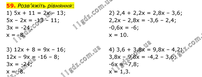 Розв’яжіть рівняння: 1) 5х + 11 = 2х – 13; 5х – 2х = -13 – 11; 3х = -24; х = -8. 2) 2,4 + 2,2х = 2,8х – 3,6; 2,2х – 2,8х = -3,6 – 2,4; -0,6х = -6; х = 10. 3) 12х + 8 = 9х – 16; 12х – 9х = -16 – 8; 3х = -24; х = -8. 4) 3,6 + 3,8х = 9,8х – 4,2; 3,8х – 9,8х = -4,2 – 3,6; -6х = -7,8; х = 1,3.