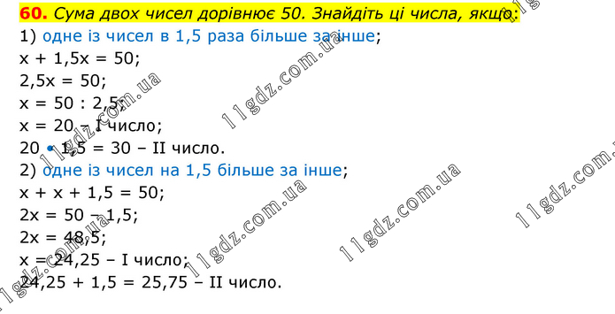 Сума двох чисел дорівнює 50. Знайдіть ці числа, якщо: 1) одне із чисел в 1,5 раза більше за інше; х + 1,5х = 50; 2,5х = 50; х = 50 : 2,5; х = 20 – І число; 20 • 1,5 = 30 – ІІ число. 2) одне із чисел на 1,5 більше за інше; х + х + 1,5 = 50; 2х = 50 – 1,5; 2х = 48,5; х = 24,25 – І число; 24,25 + 1,5 = 25,75 – ІІ число.