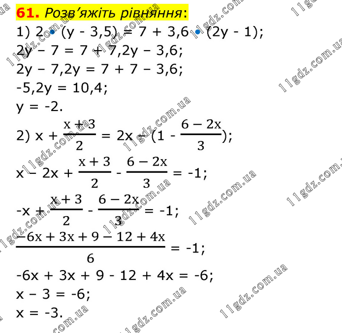 Розв’яжіть рівняння: 1) 2 • (у - 3,5) = 7 + 3,6 • (2у - 1); 2у – 7 = 7 + 7,2у – 3,6; 2у – 7,2у = 7 + 7 – 3,6; -5,2у = 10,4; у = -2. 2) x + (х + 3)/2 = 2х – (1 - (6 - 2х)/3); х – 2х + (х + 3)/2 - (6 - 2х)/3 = -1; -х + (х + 3)/2 - (6 - 2х)/3 = -1; (-6х + 3х + 9 - 12 + 4х)/6 = -1; -6х + 3х + 9 - 12 + 4х = -6; х – 3 = -6; х = -3.
