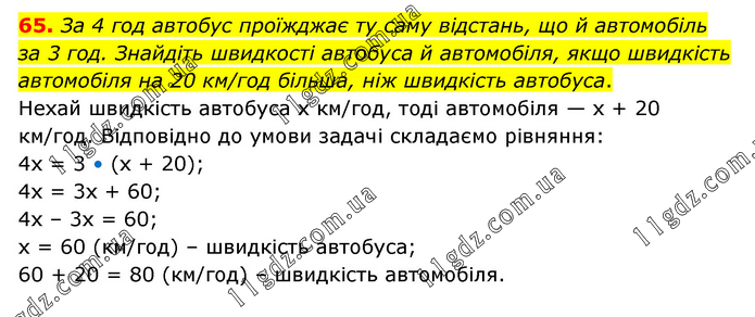 За 4 год автобус проїжджає ту саму відстань, що й автомобіль за 3 год. Знайдіть швидкості автобуса й автомобіля, якщо швидкість автомобіля на 20 км/год більша, ніж швидкість автобуса. Нехай швидкість автобуса х км/год, тоді автомобіля — х + 20 км/год. Відповідно до умови задачі складаємо рівняння: 4х = 3 • (х + 20); 4х = 3х + 60; 4х – 3х = 60; х = 60 (км/год) – швидкість автобуса; 60 + 20 = 80 (км/год) – швидкість автомобіля.
