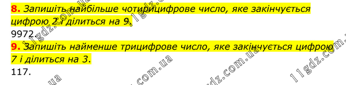 8. Запишіть найбільше чотирицифрове число, яке закінчується цифрою 2 і ділиться на 9. 9972. 9. Запишіть найменше трицифрове число, яке закінчується цифрою 7 і ділиться на 3. 117.