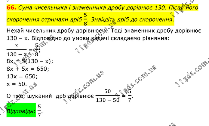Сума чисельника і знаменника дробу дорівнює 130. Після його скорочення отримали дріб 5/8. Знайдіть дріб до скорочення. Нехай чисельник дробу дорівнює х. Тоді знаменник дробу дорівнює 130 – х. Відповідно до умови задачі складаємо рівняння: х/(130 - х) = 5/8; 8х = 5(130 – х); 8х + 5х = 650; 13х = 650; х = 50. О тже, шуканий дрб дорівнює 50/(130 - 50) = 5/7. Відповідь: 5/7.
