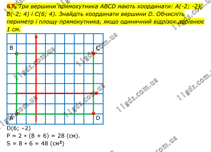 67. Три вершини прямокутника ABCD мають координати: А(-2; -2), В(-2; 4) і С(6; 4). Знайдіть координати вершини D. Обчисліть периметр і площу прямокутника, якщо одиничний відрізок дорівнює 1 см. D(6; –2) Р = 2 • (8 + 6) = 28 (см). S = 8 • 6 = 48 (см2)