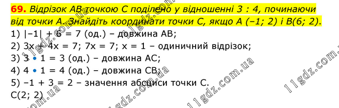 Відрізок AB точкою C поділено у відношенні 3 : 4, починаючи від точки А. Знайдіть координати точки С, якщо А (–1; 2) і В(6; 2). 1) |–1| + 6 = 7 (од.) – довжина АВ; 2) 3х + 4х = 7; 7х = 7; х = 1 – одиничний відрізок; 3) 3 • 1 = 3 (од.) – довжина АС; 4) 4 • 1 = 4 (од.) – довжина СВ; 5) –1 + 3 = 2 – значення абсциси точки С. С(2; 2)