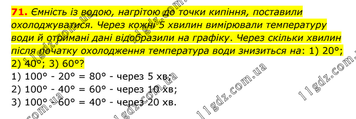 Ємність із водою, нагрітою до точки кипіння, поставили охолоджуватися. Через кожні 5 хвилин вимірювали температуру води й отримані дані відобразили на графіку. Через скільки хвилин після початку охолодження температура води знизиться на: 1) 20°; 2) 40°; 3) 60°? 1) 100° - 20° = 80° - через 5 хв; 2) 100° - 40° = 60° - через 10 хв; 3) 100° - 60° = 40° - через 20 хв.