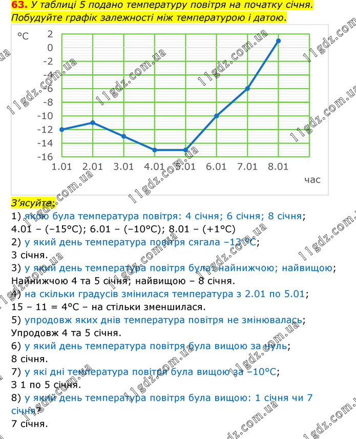 У таблиці 5 подано температуру повітря на початку січня. Побудуйте графік залежності між температурою і датою. З’ясуйте: 1) якою була температура повітря: 4 січня; 6 січня; 8 січня; 4.01 – (–15°С); 6.01 – (–10°С); 8.01 – (+1°С) 2) у який день температура повітря сягала –13 °С; 3 січня. 3) у який день температура повітря була: найнижчою; найвищою; Найнижчою 4 та 5 січня; найвищою – 8 січня. 4) на скільки градусів змінилася температура з 2.01 по 5.01; 15 – 11 = 4°С – на стільки зменшилася. 5) упродовж яких днів температура повітря не змінювалась; Упродовж 4 та 5 січня. 6) у який день температура повітря була вищою за нуль; 8 січня. 7) у які дні температура повітря була вищою за –10°С; З 1 по 5 січня. 8) у який день температура повітря була вищою: 1 січня чи 7 січня? 7 січня.
