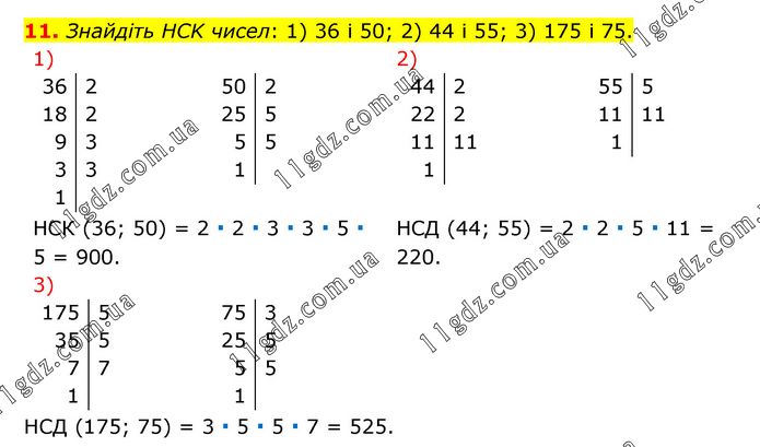 Знайдіть HCK чисел: 1) 36 і 50; 2) 44 і 55; 3) 175 і 75. НСК (36; 50) = 2 ∙ 2 ∙ 3 ∙ 3 ∙ 5 ∙ 5 = 900. НСД (44; 55) = 2 ∙ 2 ∙ 5 ∙ 11 = 220. НСД (175; 75) = 3 ∙ 5 ∙ 5 ∙ 7 = 525.