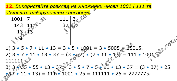 Використайте розклад на множники чисел 1001 і 111 та обчисліть найзручнішим способом: 1) 3 • 5 • 7 • 11 • 13 = 3 • 5 • 1001 = 3 • 5005 = 15015. 2) 3 • 7 • 11 • 13 • 37 = (3 • 37) • (7 • 11 • 13) = 111 • 1001 = 111111. 3) 3 • 35 • 55 • 13 • 37 = 3 • 5 • 7 • 5 • 11 • 13 • 37 = (3 • 37) • 25 • (7 • 11 • 13) = 111 • 1001 • 25 = 111111 • 25 = 2777775.