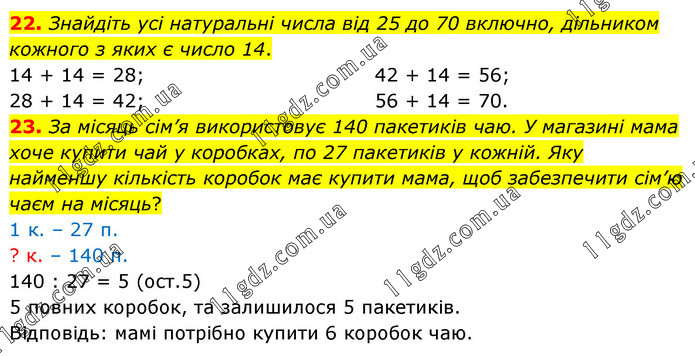 22. Знайдіть усі натуральні числа від 25 до 70 включно, дільником кожного з яких є число 14. 14 + 14 = 28; 28 + 14 = 42; 42 + 14 = 56; 56 + 14 = 70. 23. За місяць сім’я використовує 140 пакетиків чаю. У магазині мама хоче купити чай у коробках, по 27 пакетиків у кожній. Яку найменшу кількість коробок має купити мама, щоб забезпечити сім’ю чаєм на місяць? 1 к. – 27 п. ? к. – 140 п. 140 : 27 = 5 (ост.5) 5 повних коробок, та залишилося 5 пакетиків. Відповідь: мамі потрібно купити 6 коробок чаю.